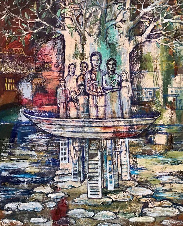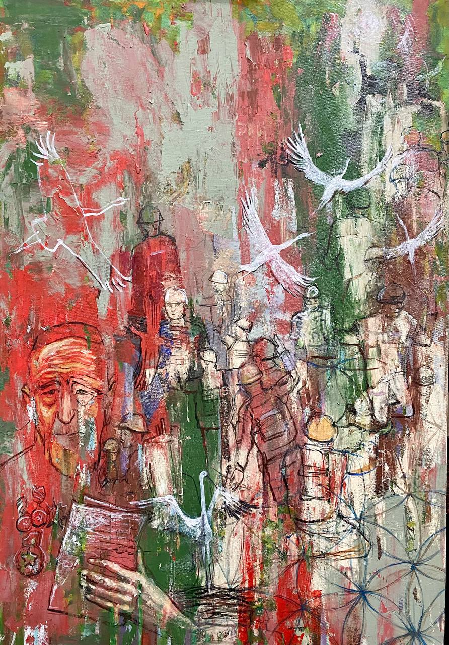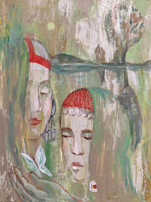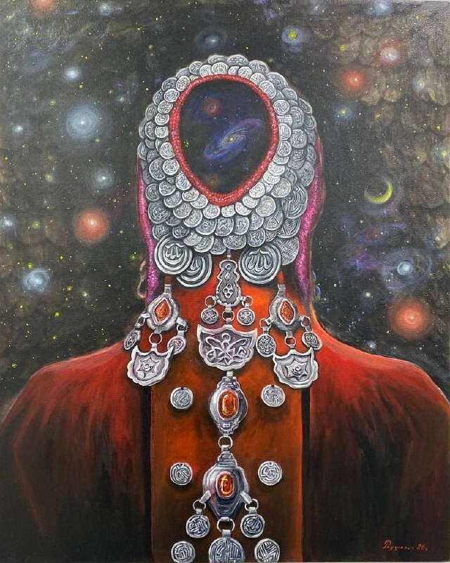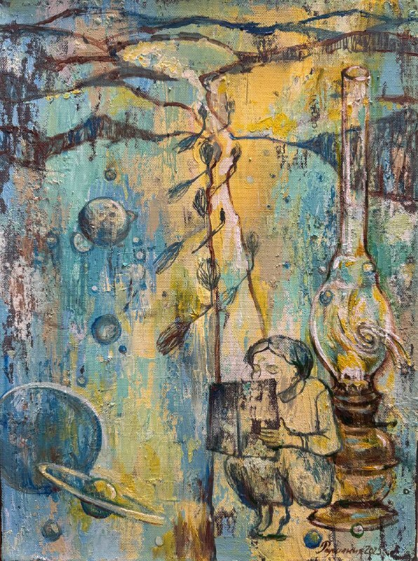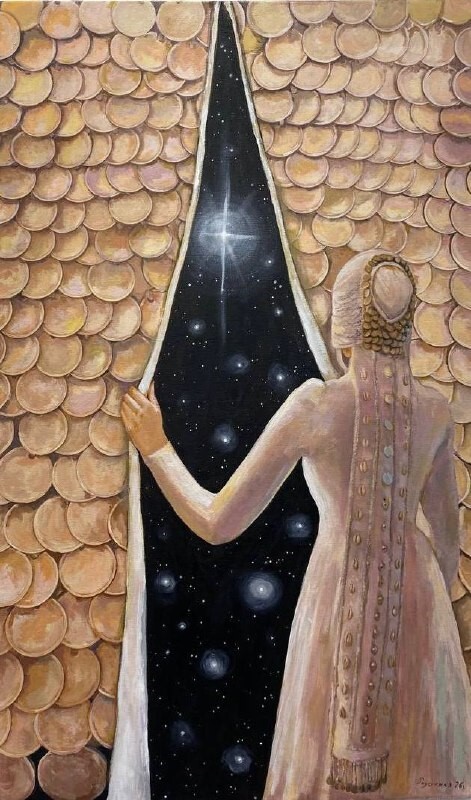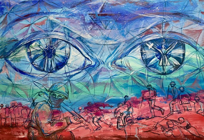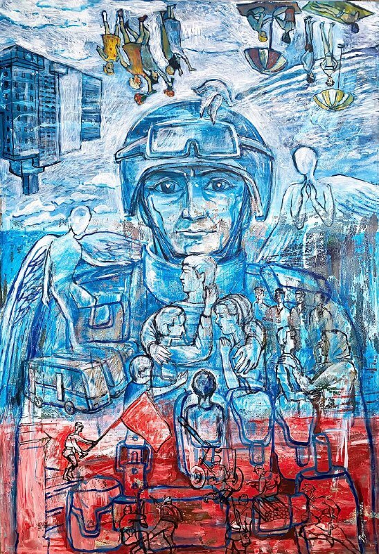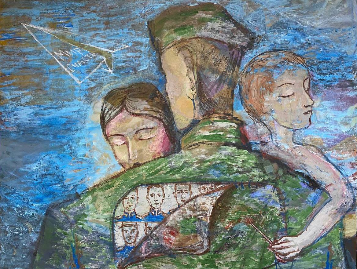 Но этот образ солдата стоял долго перед глазами, и пока я не перенесла его на холст, не могла успокоиться. У многих воевали деды, прадеды в Великую Отечественную, и это передалось генетически по роду, что символизирует красный цвет внизу картины. В центре, где обретается душа, находятся самые близкие и родные. Перевёрнутый мир - это наша реальность, и сейчас мирное время, словно параллельный мир.
