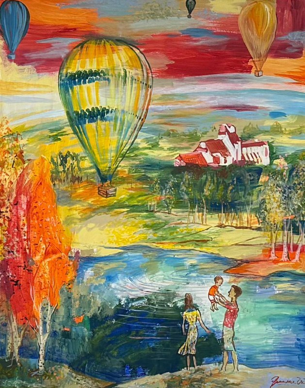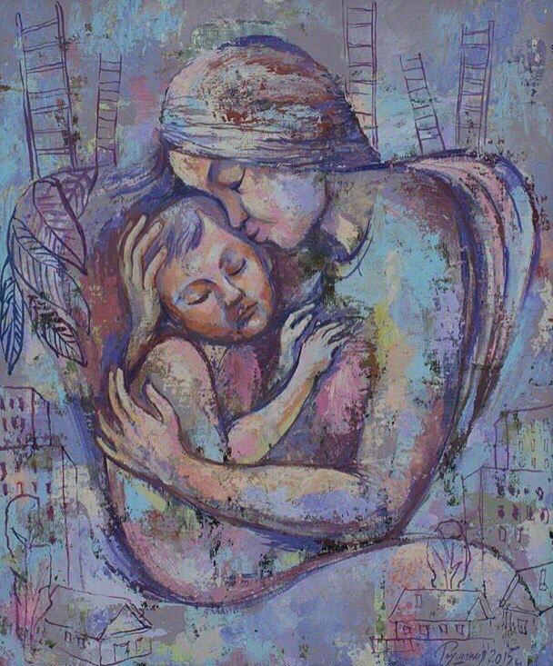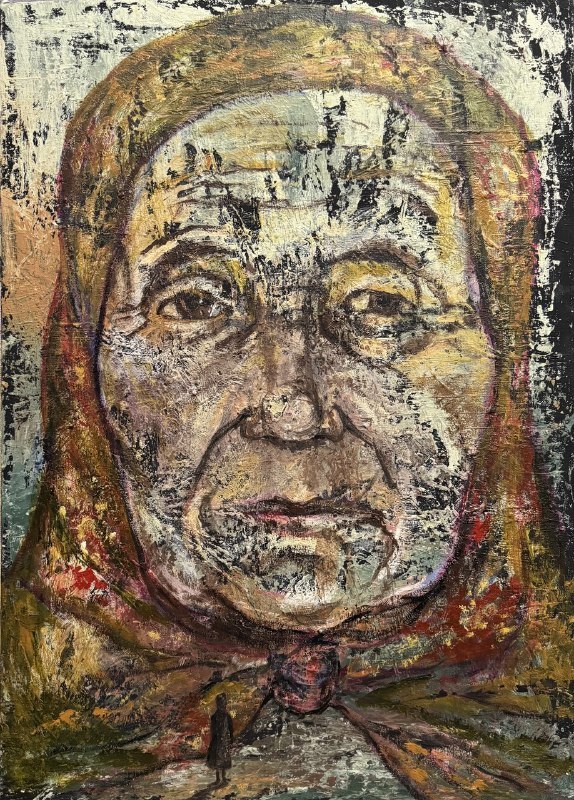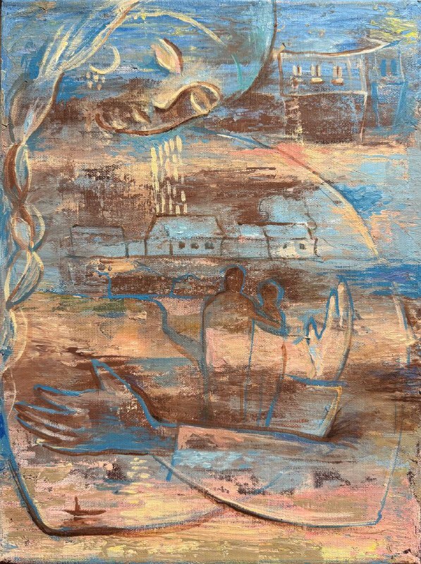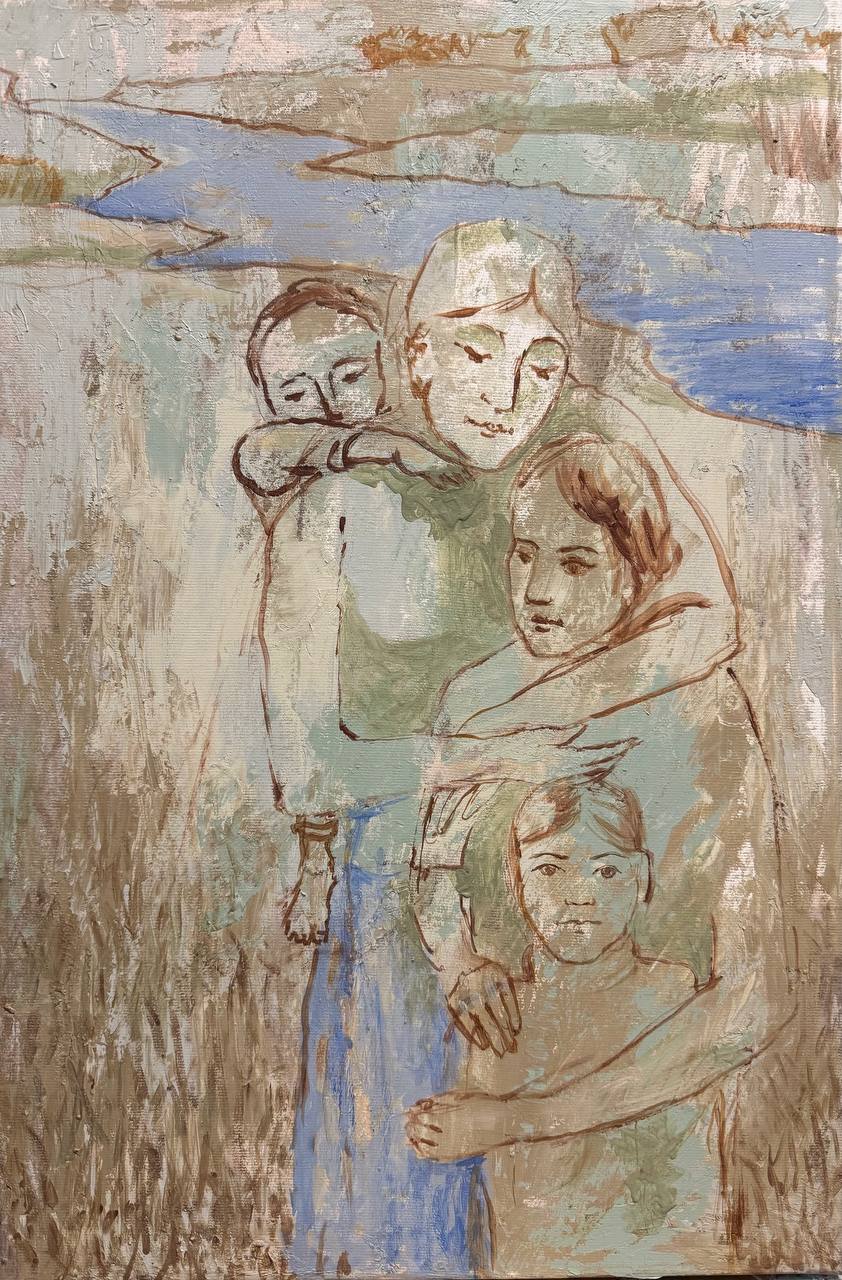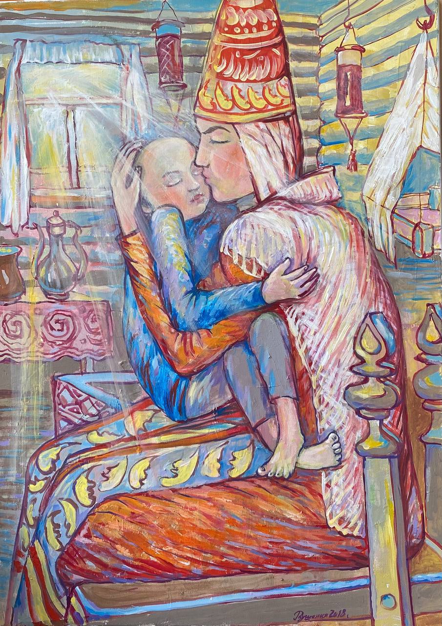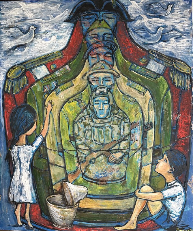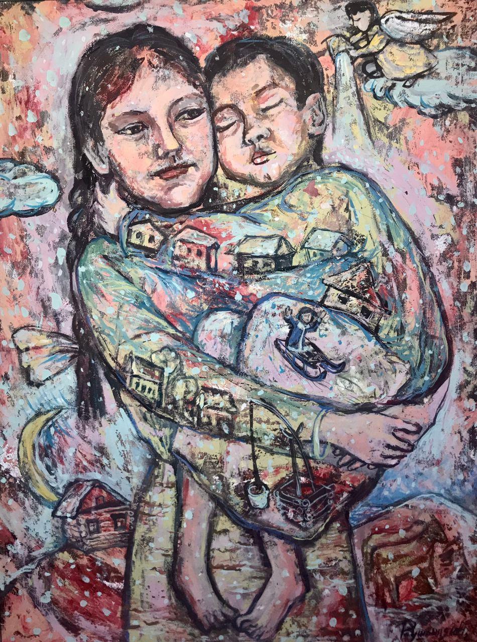 Но этот образ солдата стоял долго перед глазами, и пока я не перенесла его на холст, не могла успокоиться. У многих воевали деды, прадеды в Великую Отечественную, и это передалось генетически по роду, что символизирует красный цвет внизу картины. В центре, где обретается душа, находятся самые близкие и родные. Перевёрнутый мир - это наша реальность, и сейчас мирное время, словно параллельный мир.