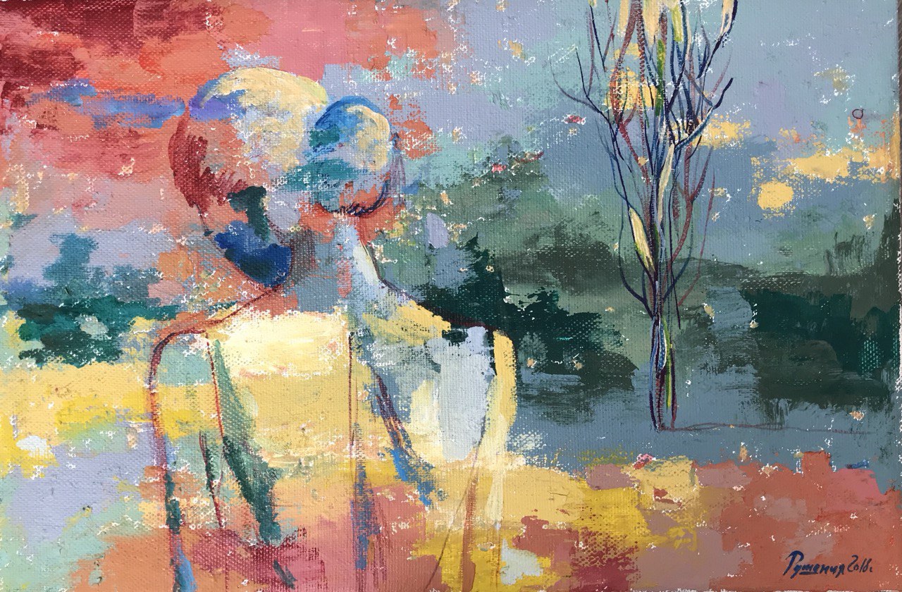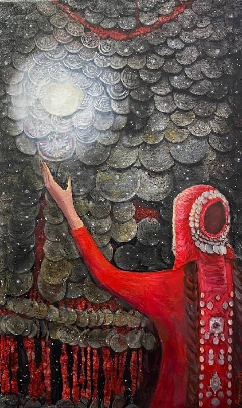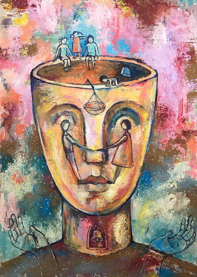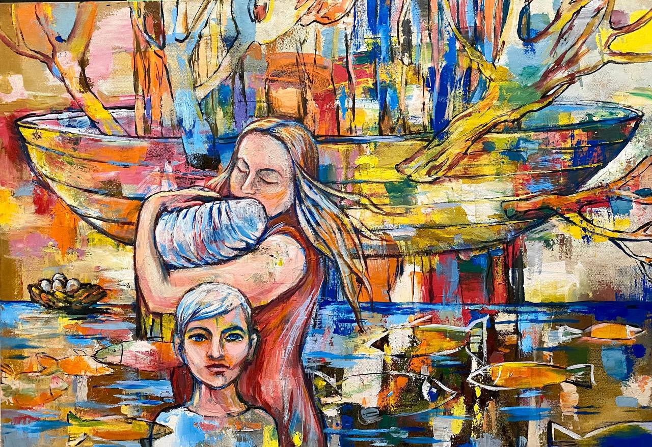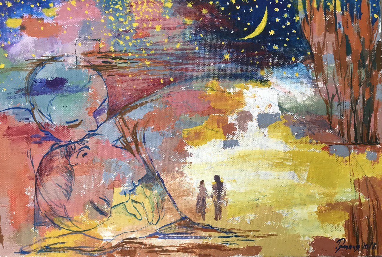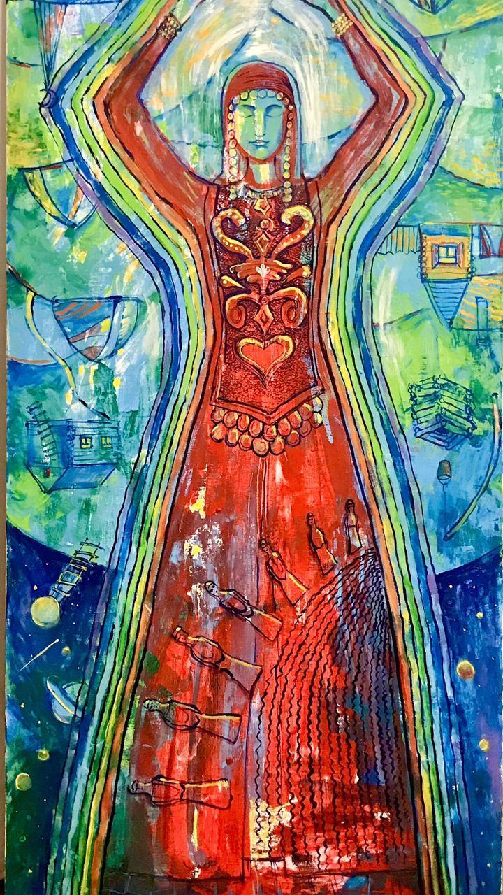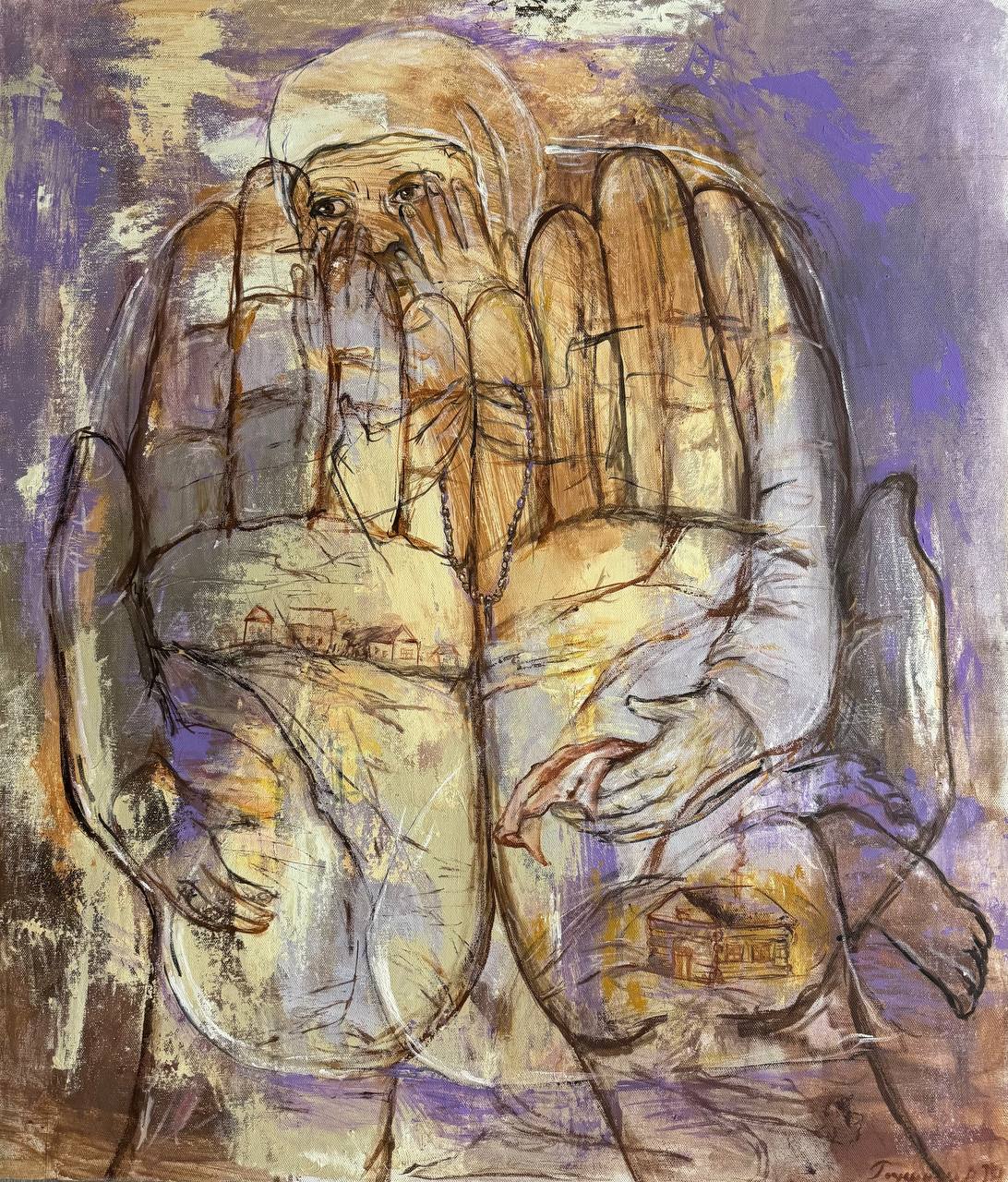 Но этот образ солдата стоял долго перед глазами, и пока я не перенесла его на холст, не могла успокоиться. У многих воевали деды, прадеды в Великую Отечественную, и это передалось генетически по роду, что символизирует красный цвет внизу картины. В центре, где обретается душа, находятся самые близкие и родные. Перевёрнутый мир - это наша реальность, и сейчас мирное время, словно параллельный мир.