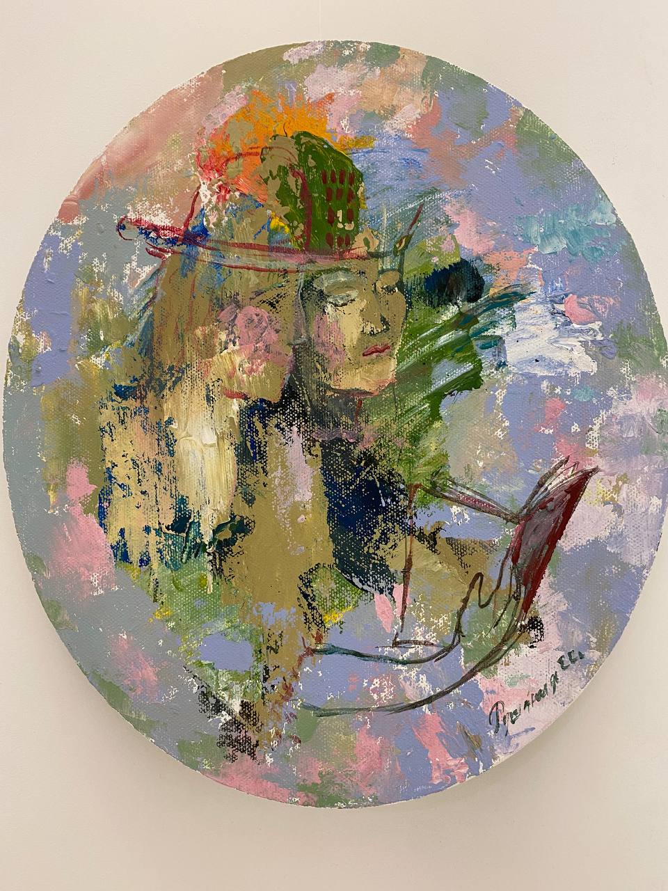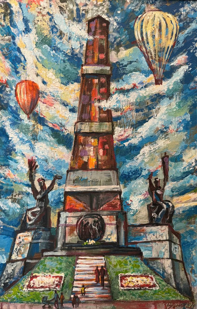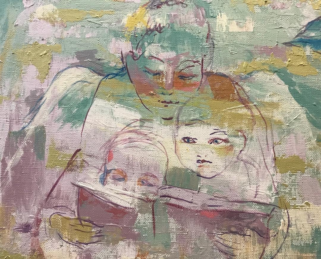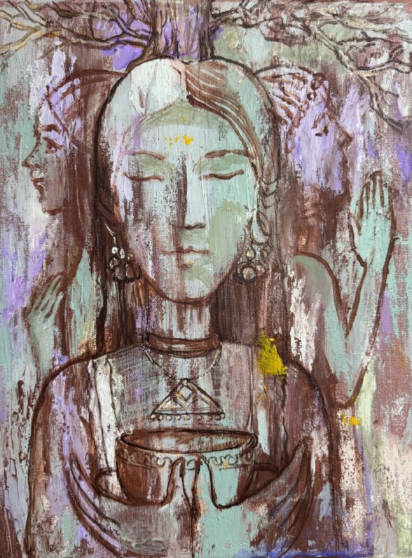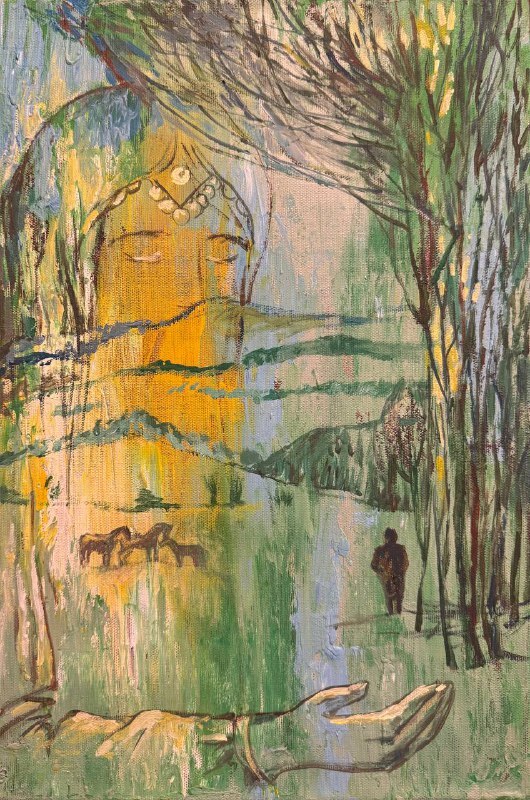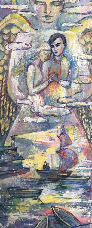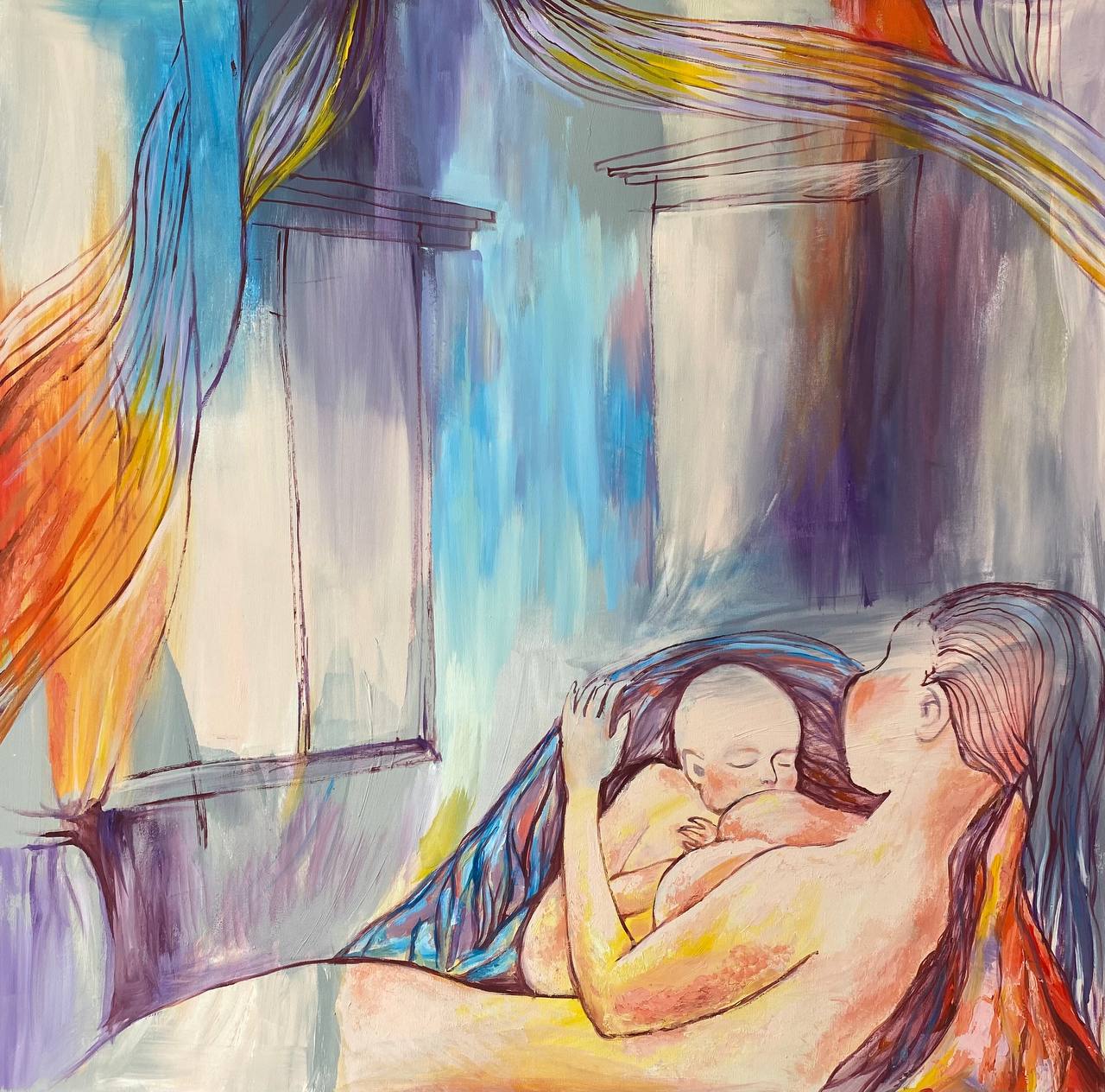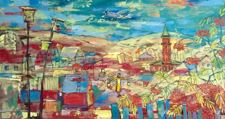 Но этот образ солдата стоял долго перед глазами, и пока я не перенесла его на холст, не могла успокоиться. У многих воевали деды, прадеды в Великую Отечественную, и это передалось генетически по роду, что символизирует красный цвет внизу картины. В центре, где обретается душа, находятся самые близкие и родные. Перевёрнутый мир - это наша реальность, и сейчас мирное время, словно параллельный мир.