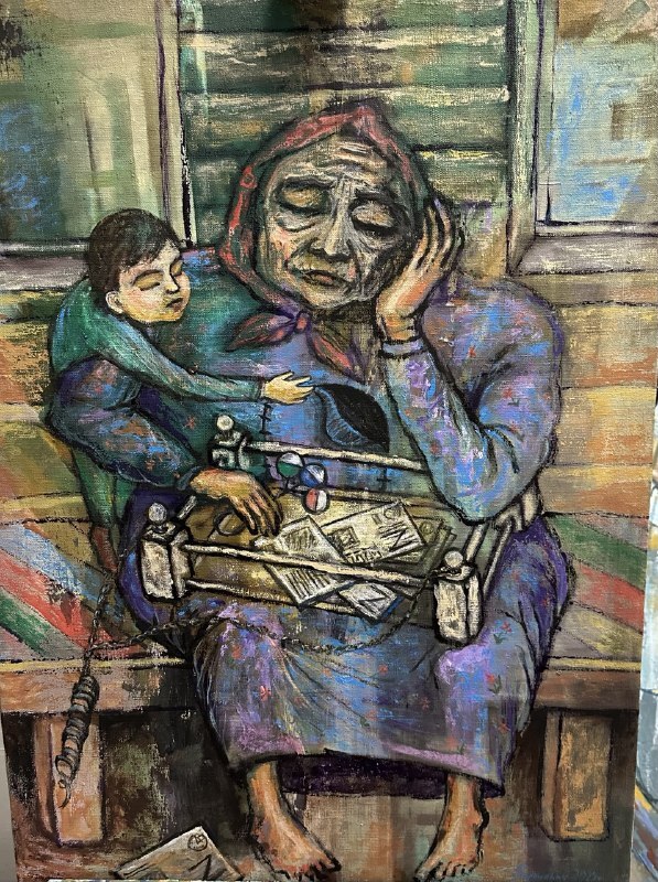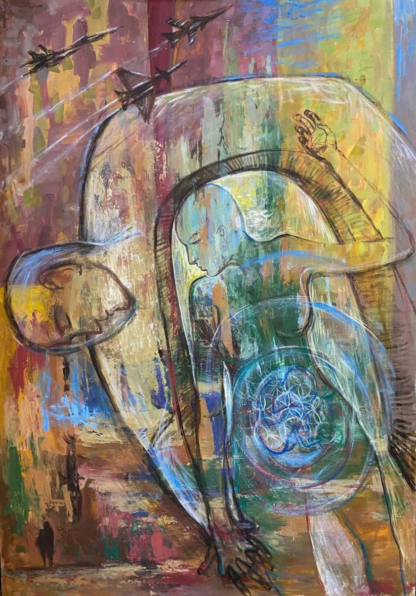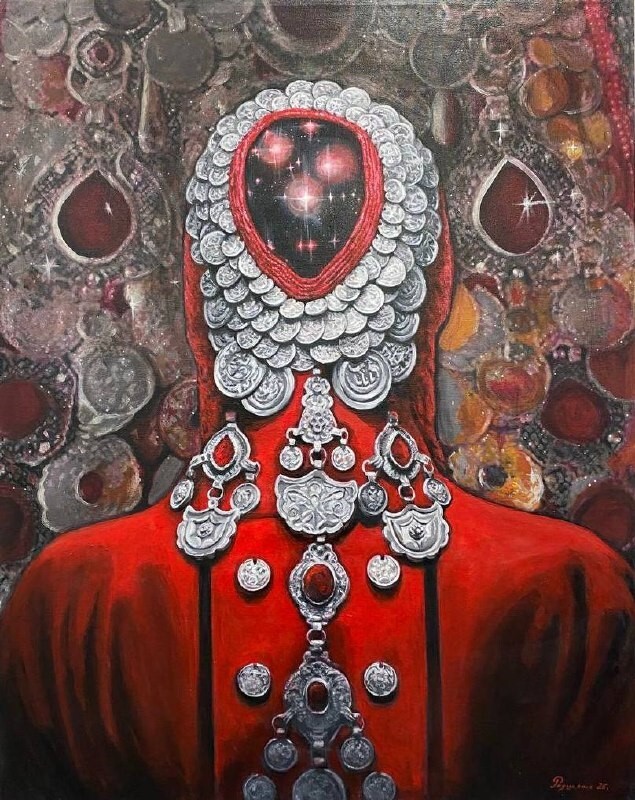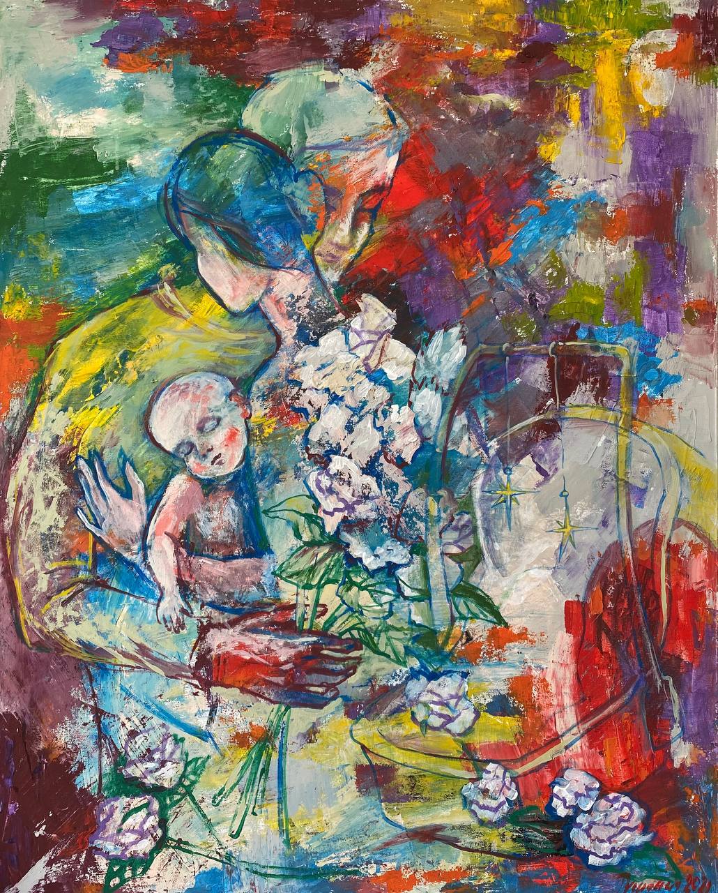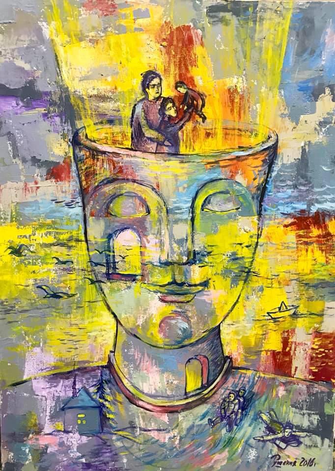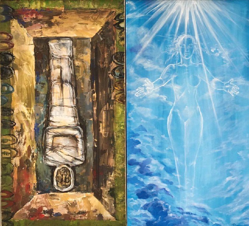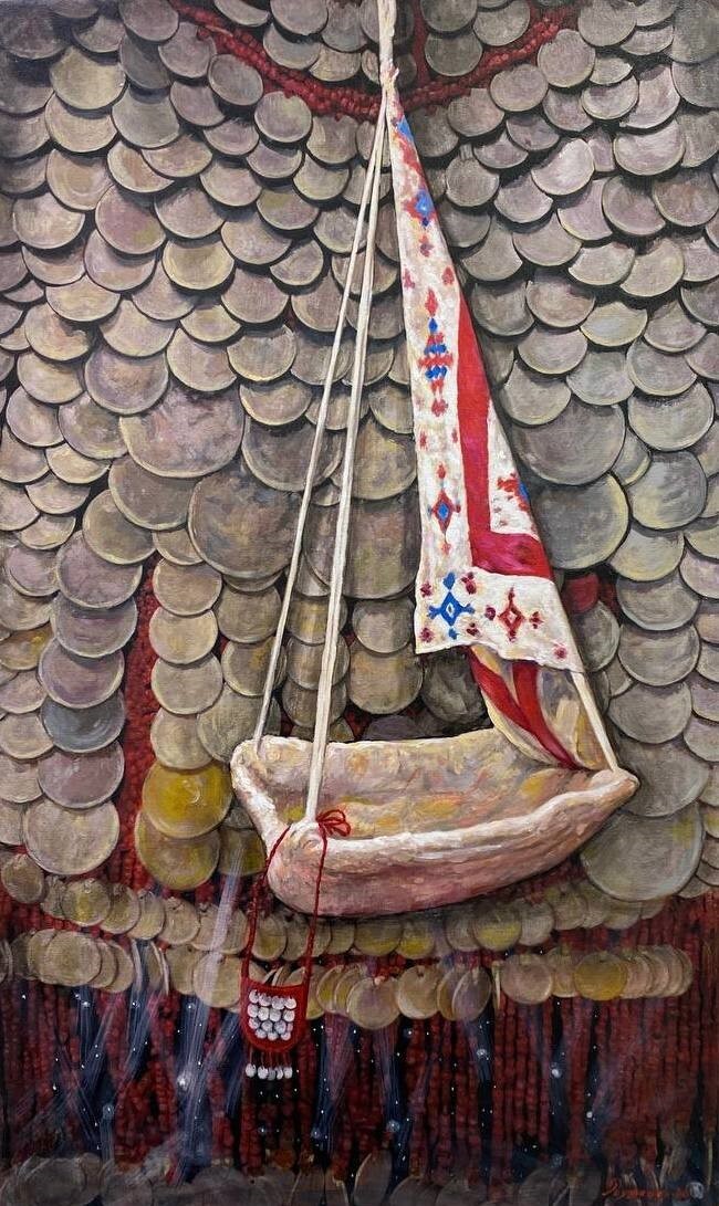Но этот образ солдата стоял долго перед глазами, и пока я не перенесла его на холст, не могла успокоиться. У многих воевали деды, прадеды в Великую Отечественную, и это передалось генетически по роду, что символизирует красный цвет внизу картины. В центре, где обретается душа, находятся самые близкие и родные. Перевёрнутый мир - это наша реальность, и сейчас мирное время, словно параллельный мир.