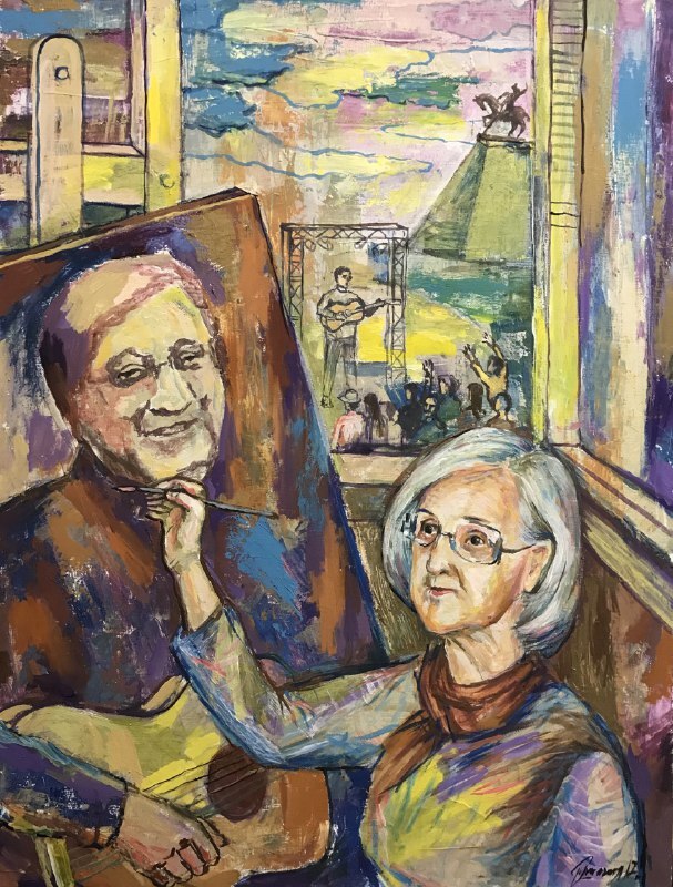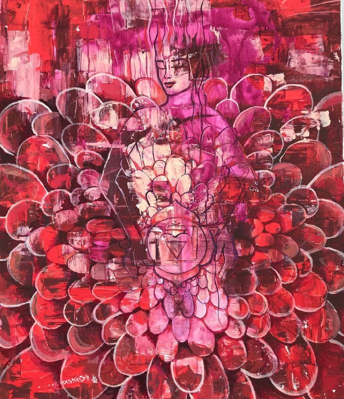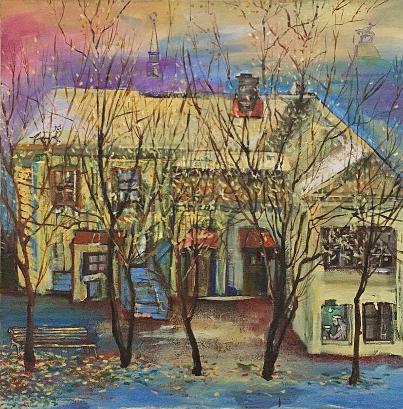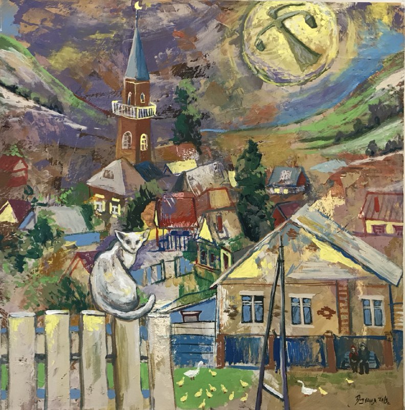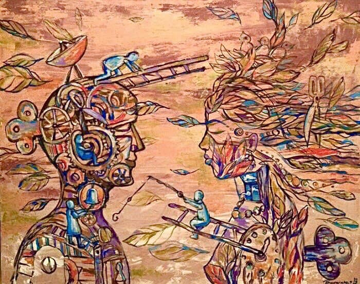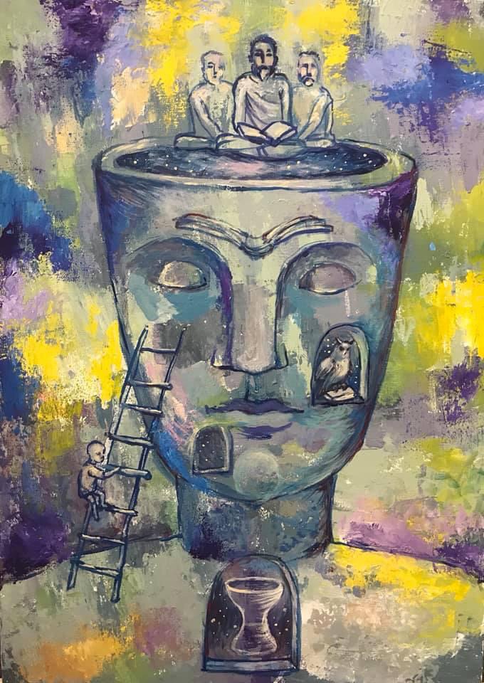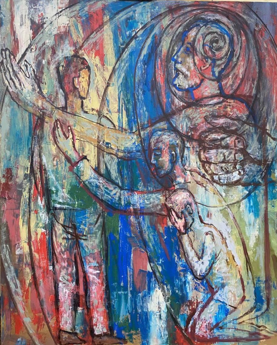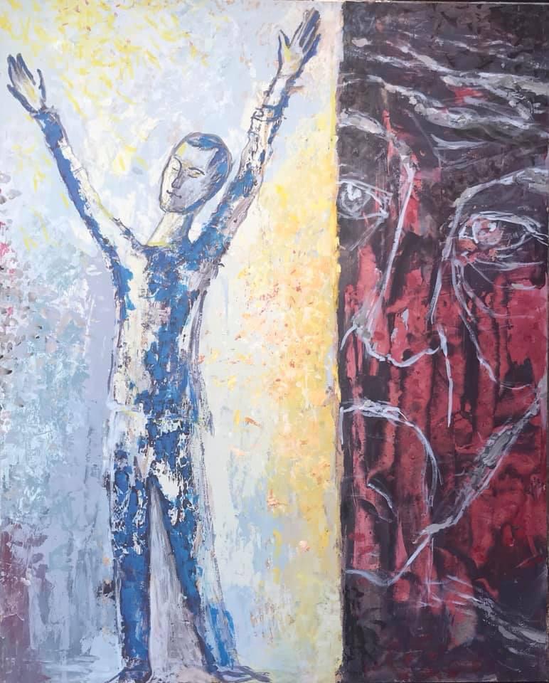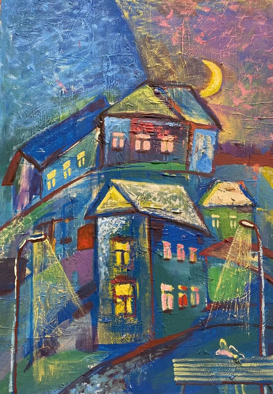 Но этот образ солдата стоял долго перед глазами, и пока я не перенесла его на холст, не могла успокоиться. У многих воевали деды, прадеды в Великую Отечественную, и это передалось генетически по роду, что символизирует красный цвет внизу картины. В центре, где обретается душа, находятся самые близкие и родные. Перевёрнутый мир - это наша реальность, и сейчас мирное время, словно параллельный мир.