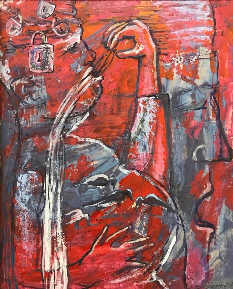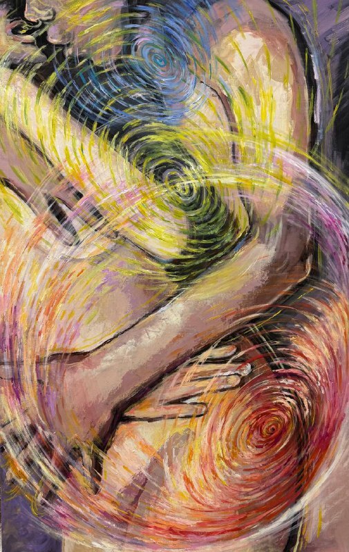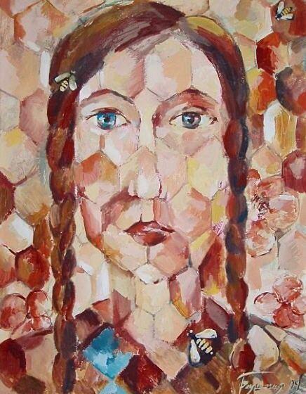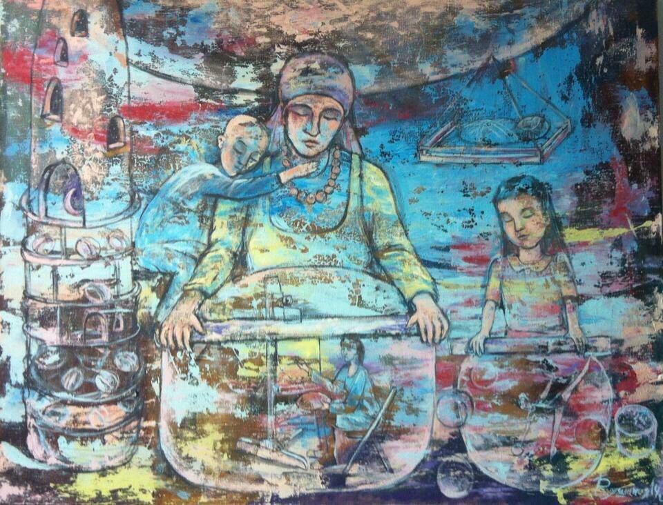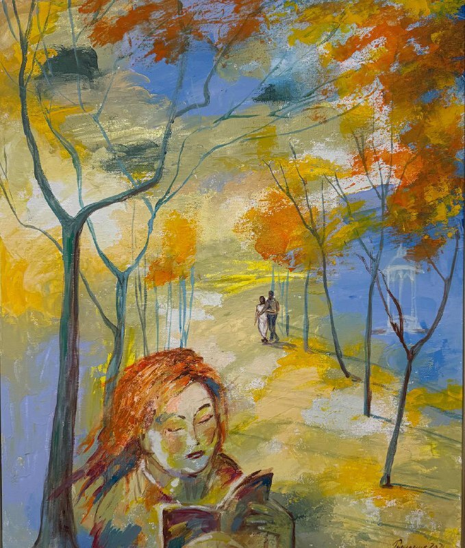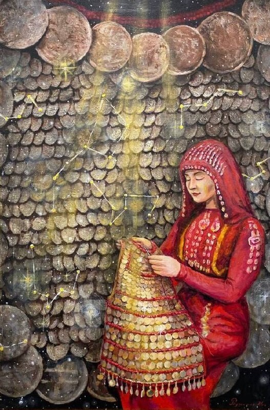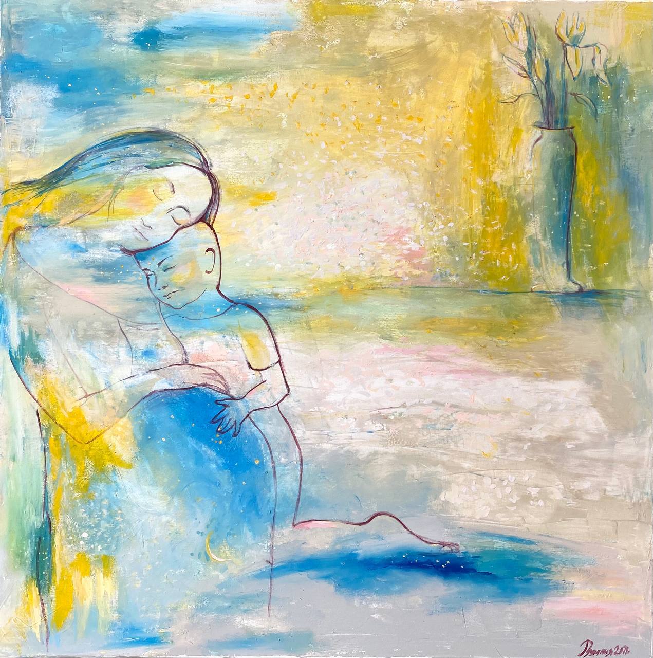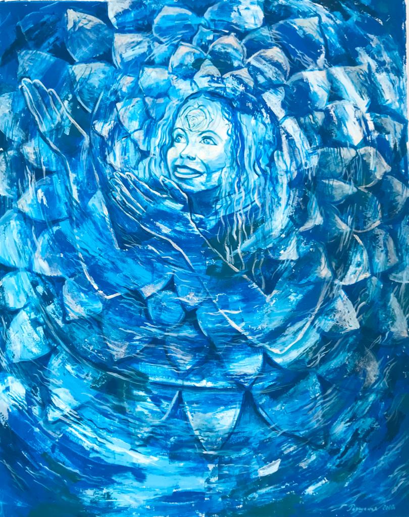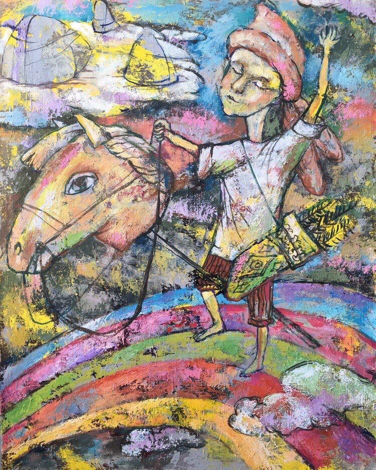 Но этот образ солдата стоял долго перед глазами, и пока я не перенесла его на холст, не могла успокоиться. У многих воевали деды, прадеды в Великую Отечественную, и это передалось генетически по роду, что символизирует красный цвет внизу картины. В центре, где обретается душа, находятся самые близкие и родные. Перевёрнутый мир - это наша реальность, и сейчас мирное время, словно параллельный мир.