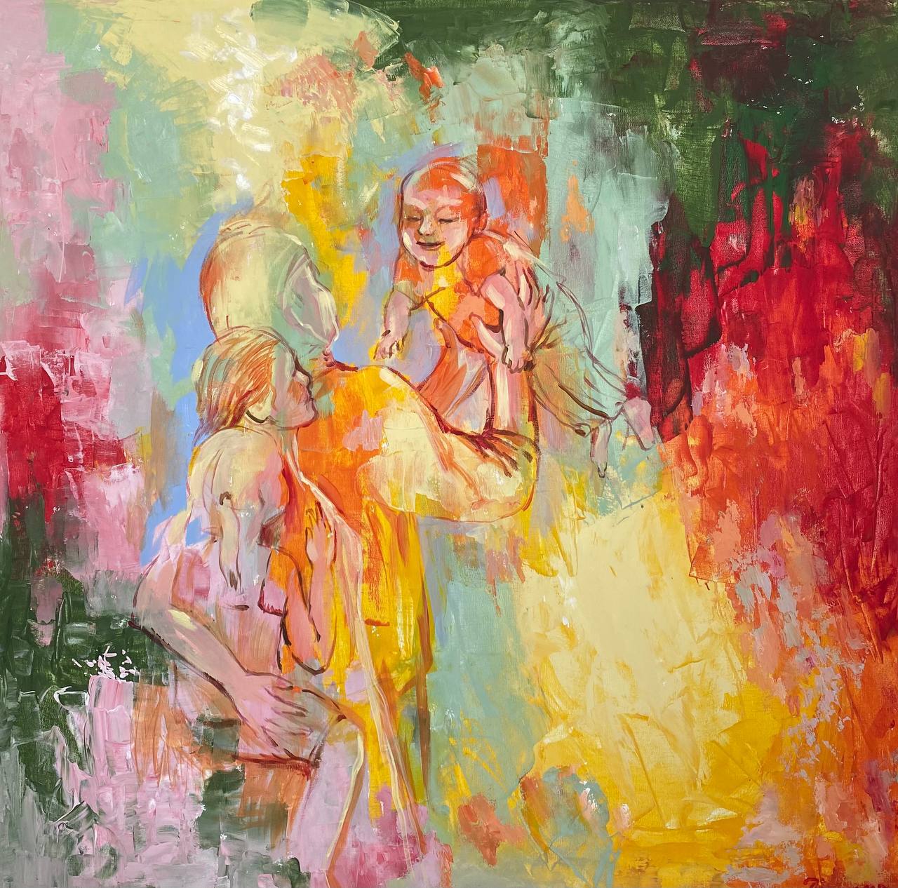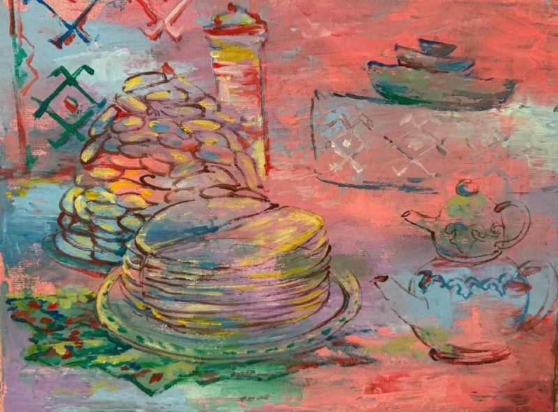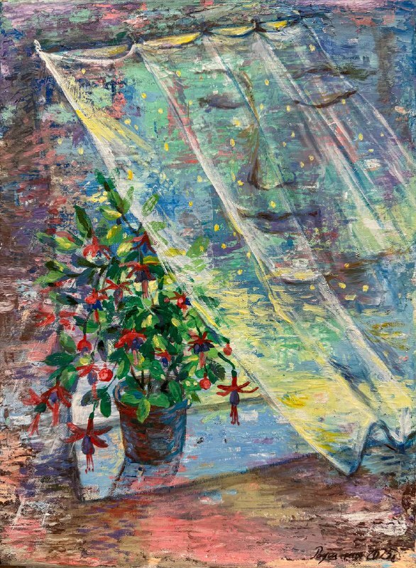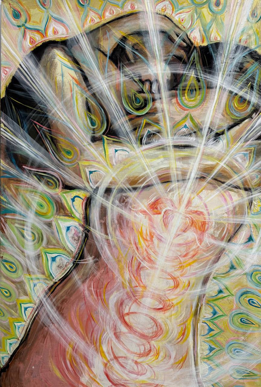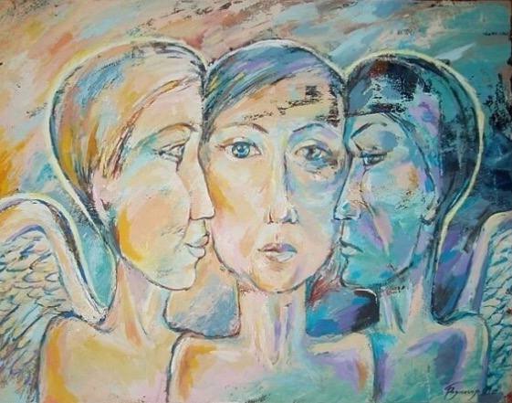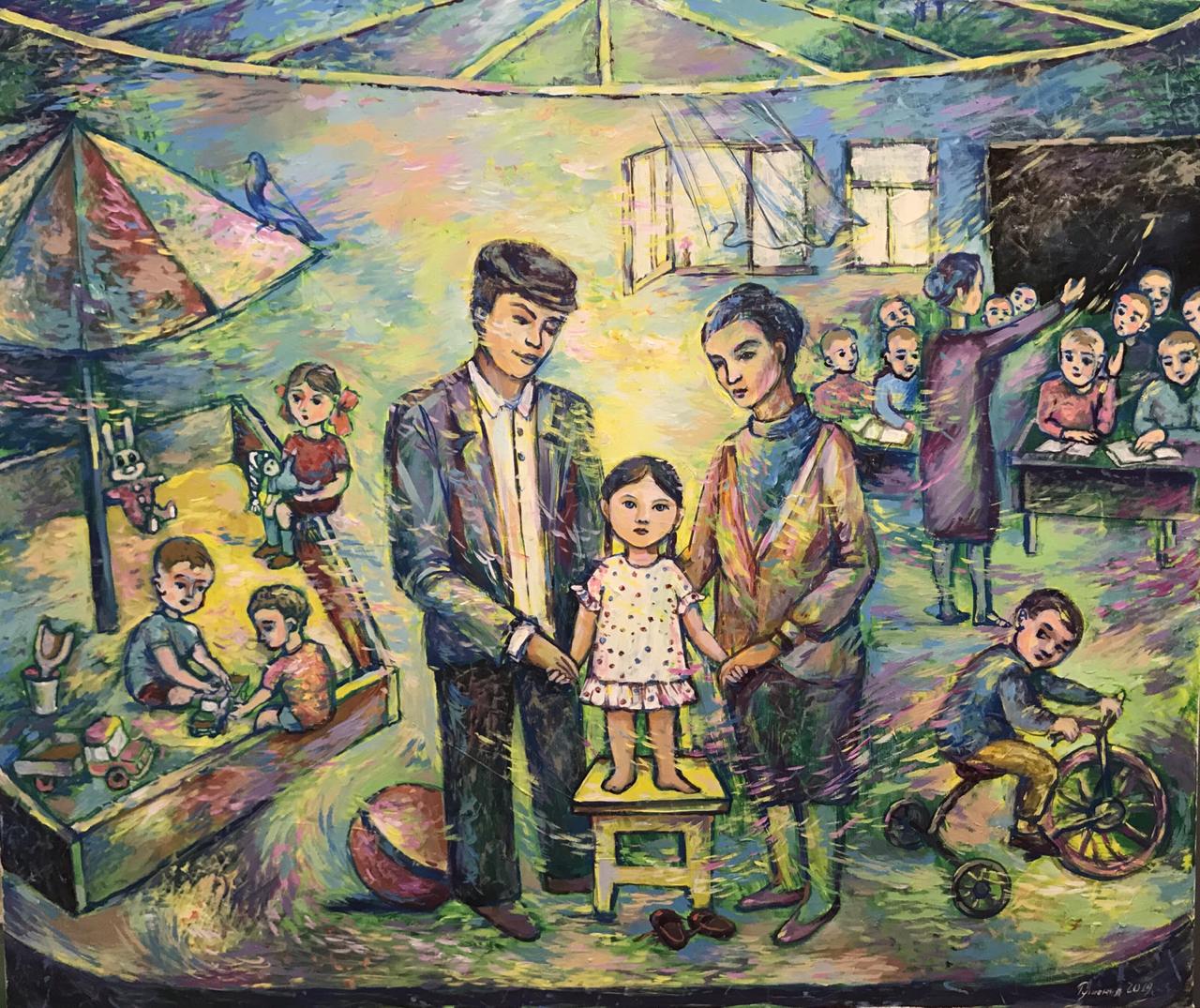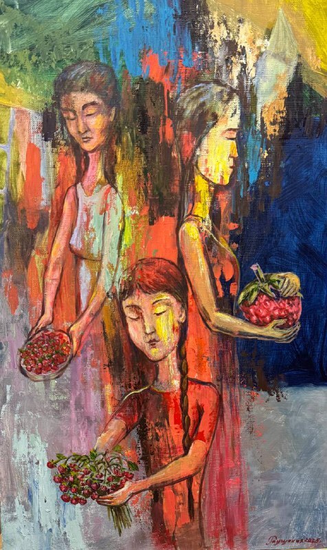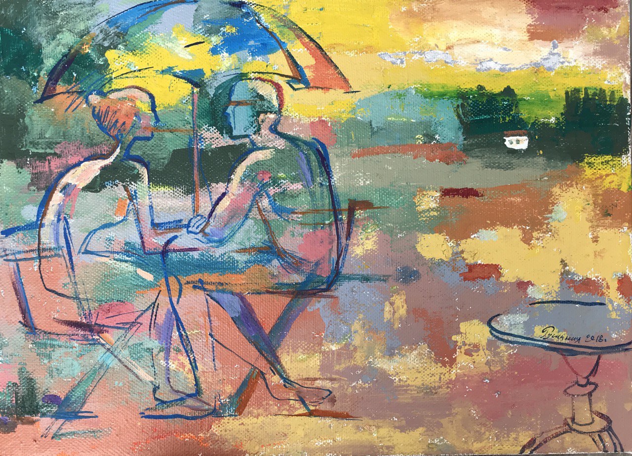 Но этот образ солдата стоял долго перед глазами, и пока я не перенесла его на холст, не могла успокоиться. У многих воевали деды, прадеды в Великую Отечественную, и это передалось генетически по роду, что символизирует красный цвет внизу картины. В центре, где обретается душа, находятся самые близкие и родные. Перевёрнутый мир - это наша реальность, и сейчас мирное время, словно параллельный мир.