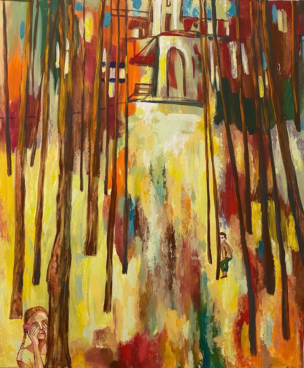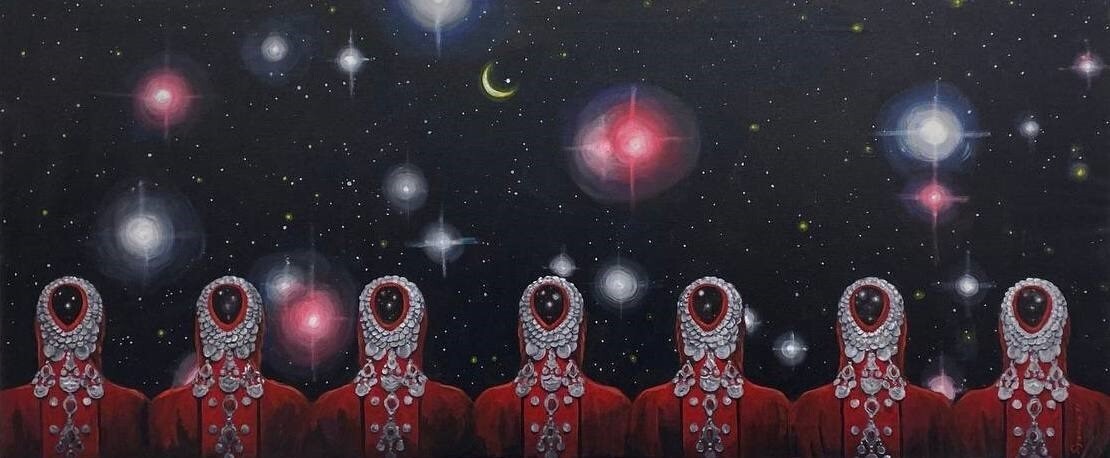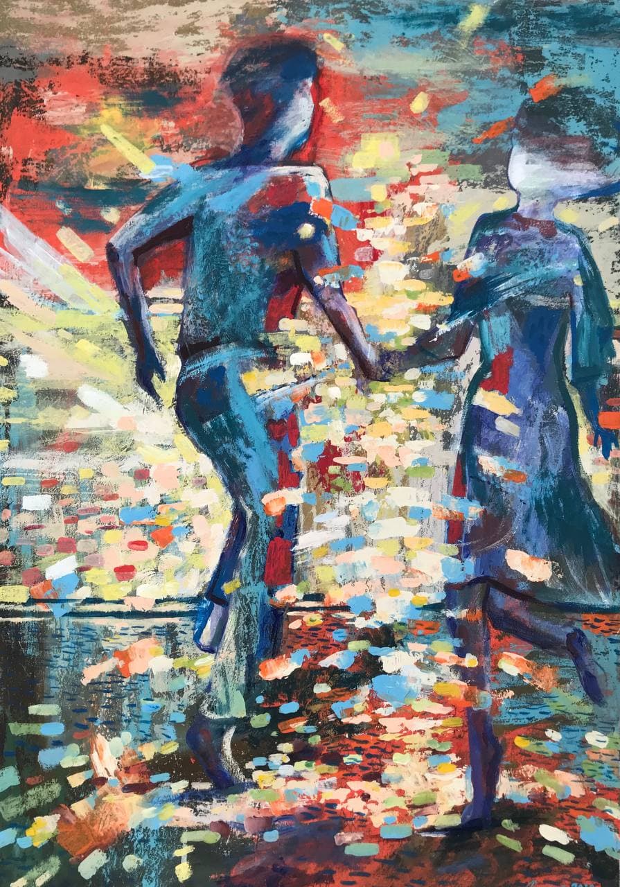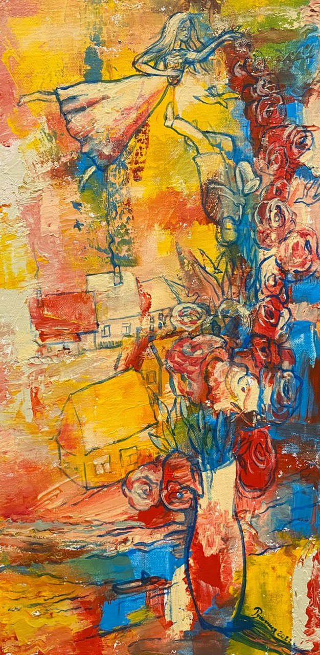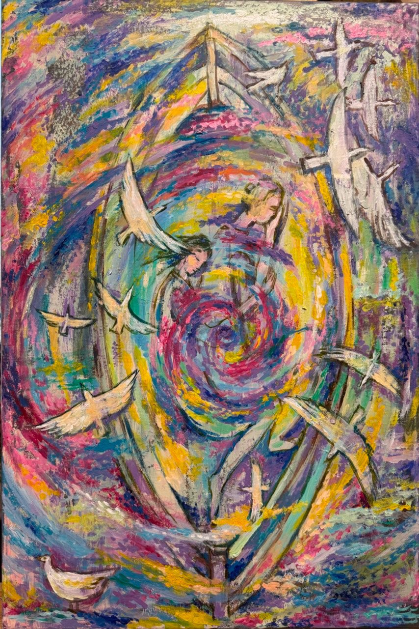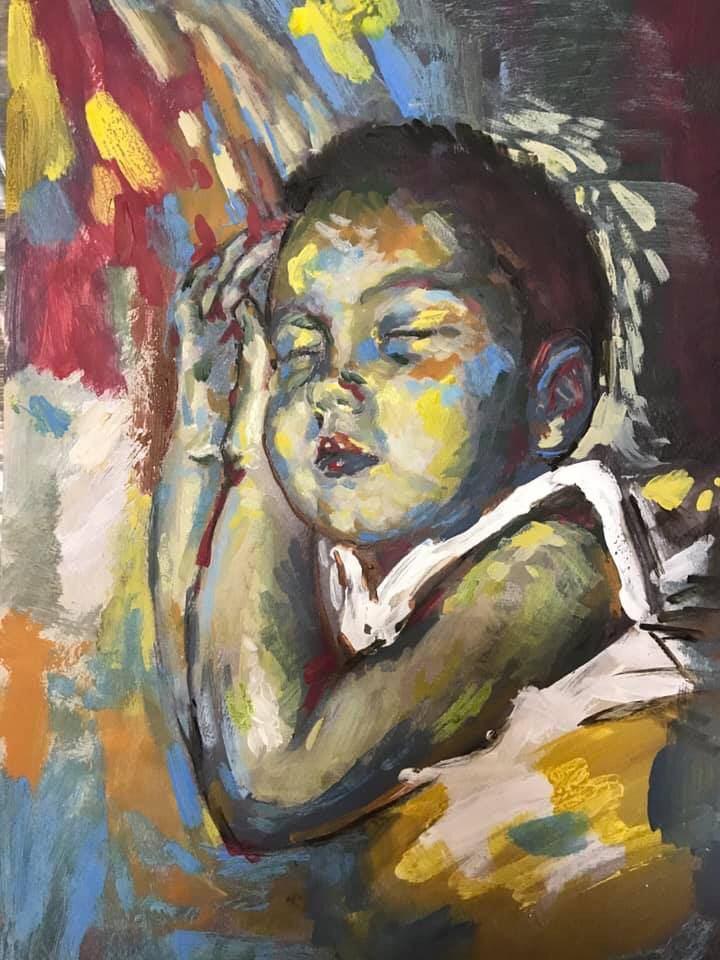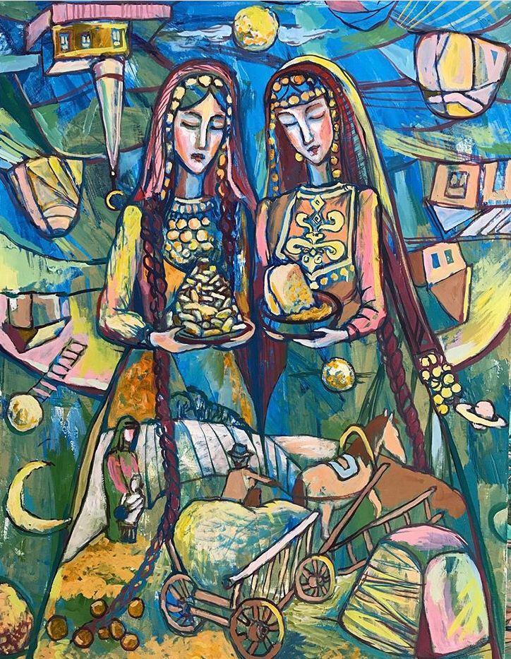 Но этот образ солдата стоял долго перед глазами, и пока я не перенесла его на холст, не могла успокоиться. У многих воевали деды, прадеды в Великую Отечественную, и это передалось генетически по роду, что символизирует красный цвет внизу картины. В центре, где обретается душа, находятся самые близкие и родные. Перевёрнутый мир - это наша реальность, и сейчас мирное время, словно параллельный мир.