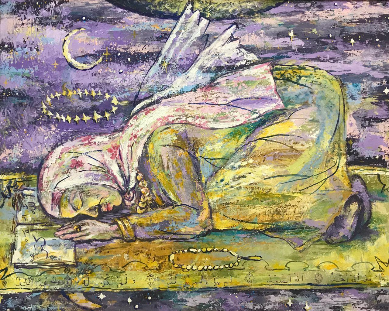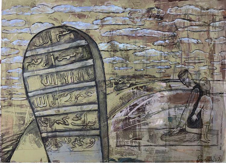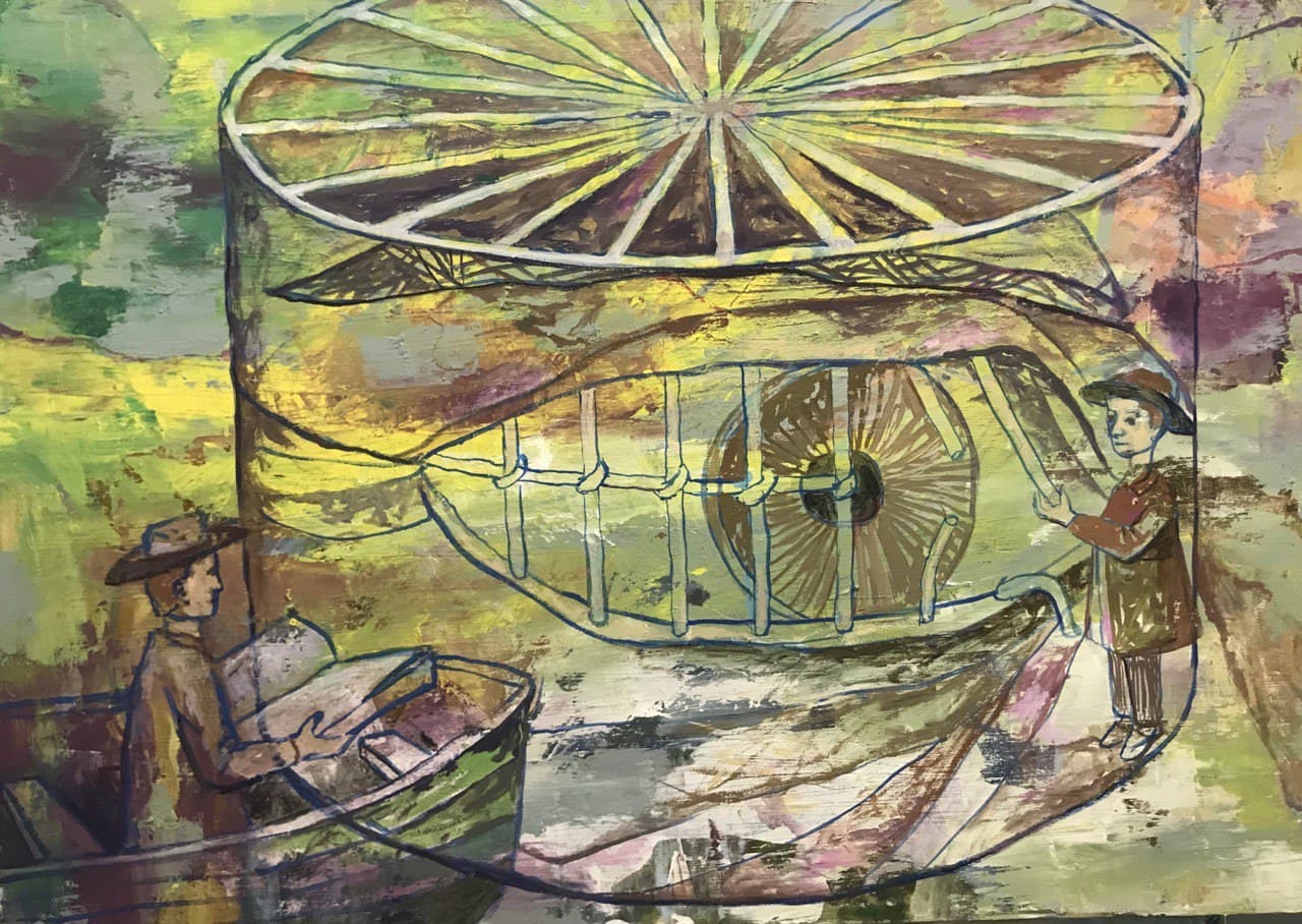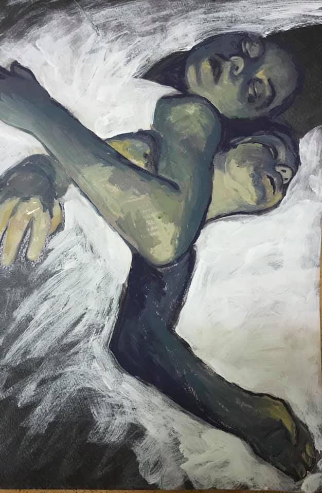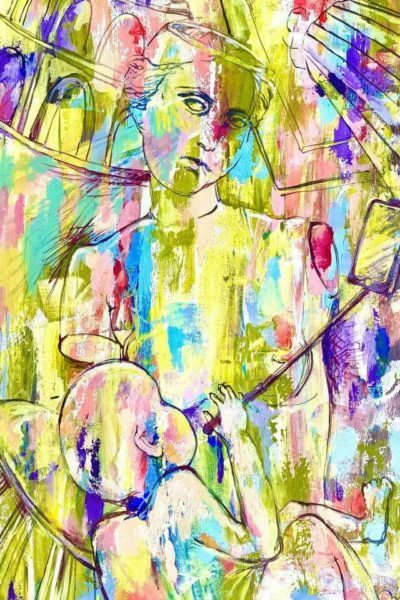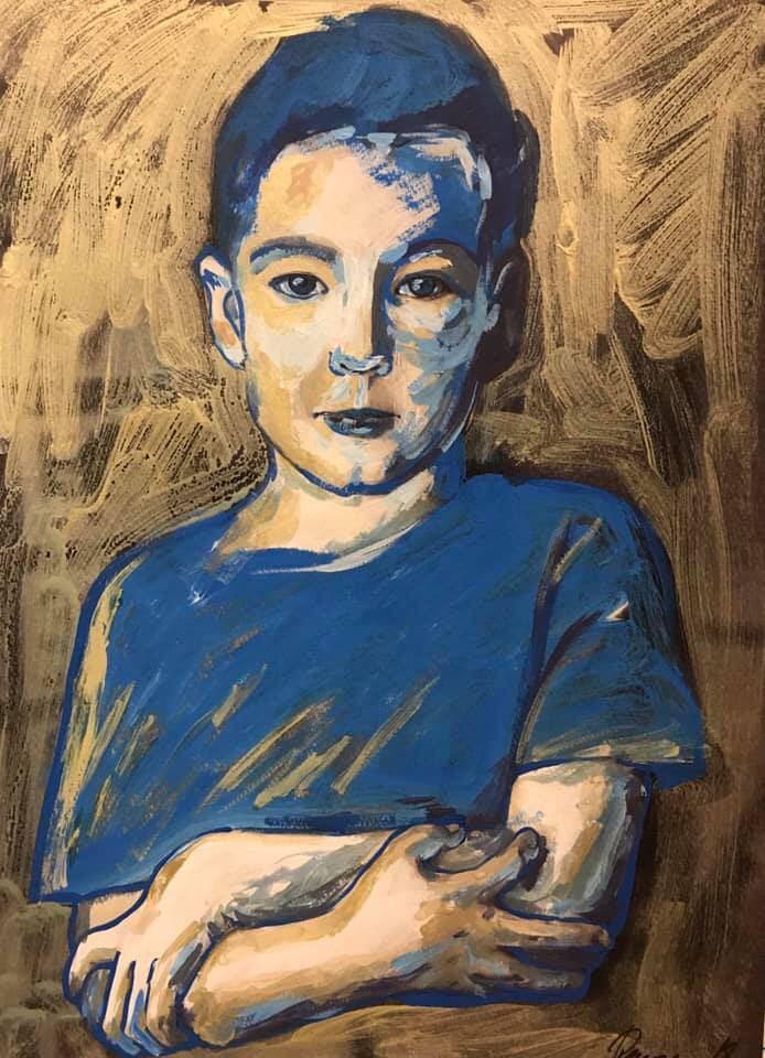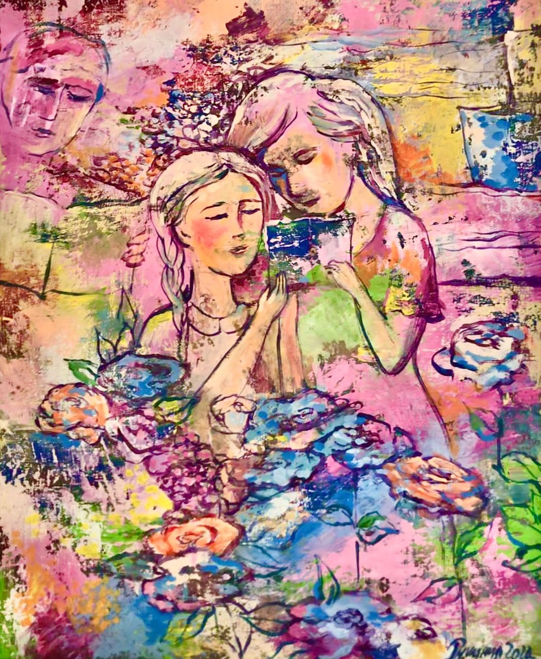 Но этот образ солдата стоял долго перед глазами, и пока я не перенесла его на холст, не могла успокоиться. У многих воевали деды, прадеды в Великую Отечественную, и это передалось генетически по роду, что символизирует красный цвет внизу картины. В центре, где обретается душа, находятся самые близкие и родные. Перевёрнутый мир - это наша реальность, и сейчас мирное время, словно параллельный мир.